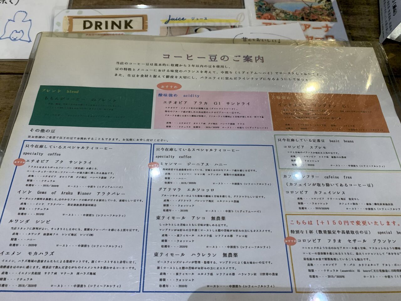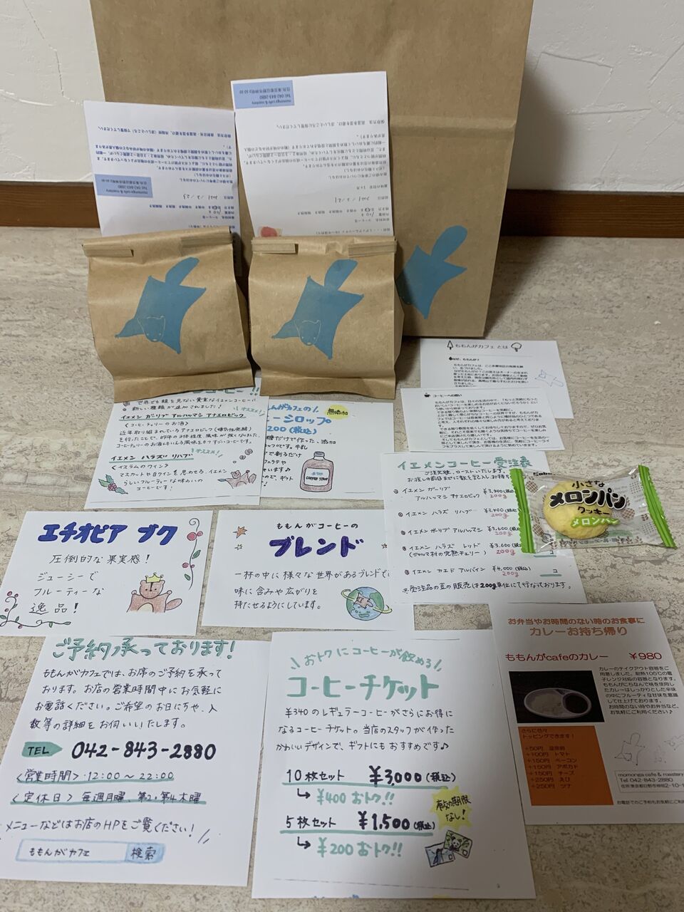 ももんがのスタンプだらけだ。ミニメロンパンのおまけ。そして珈琲豆の説明の紙を留めているシールは、ももんがではなく桃。カレーにも、ももんがにちなんで(!?)桃が使われているらしい!?