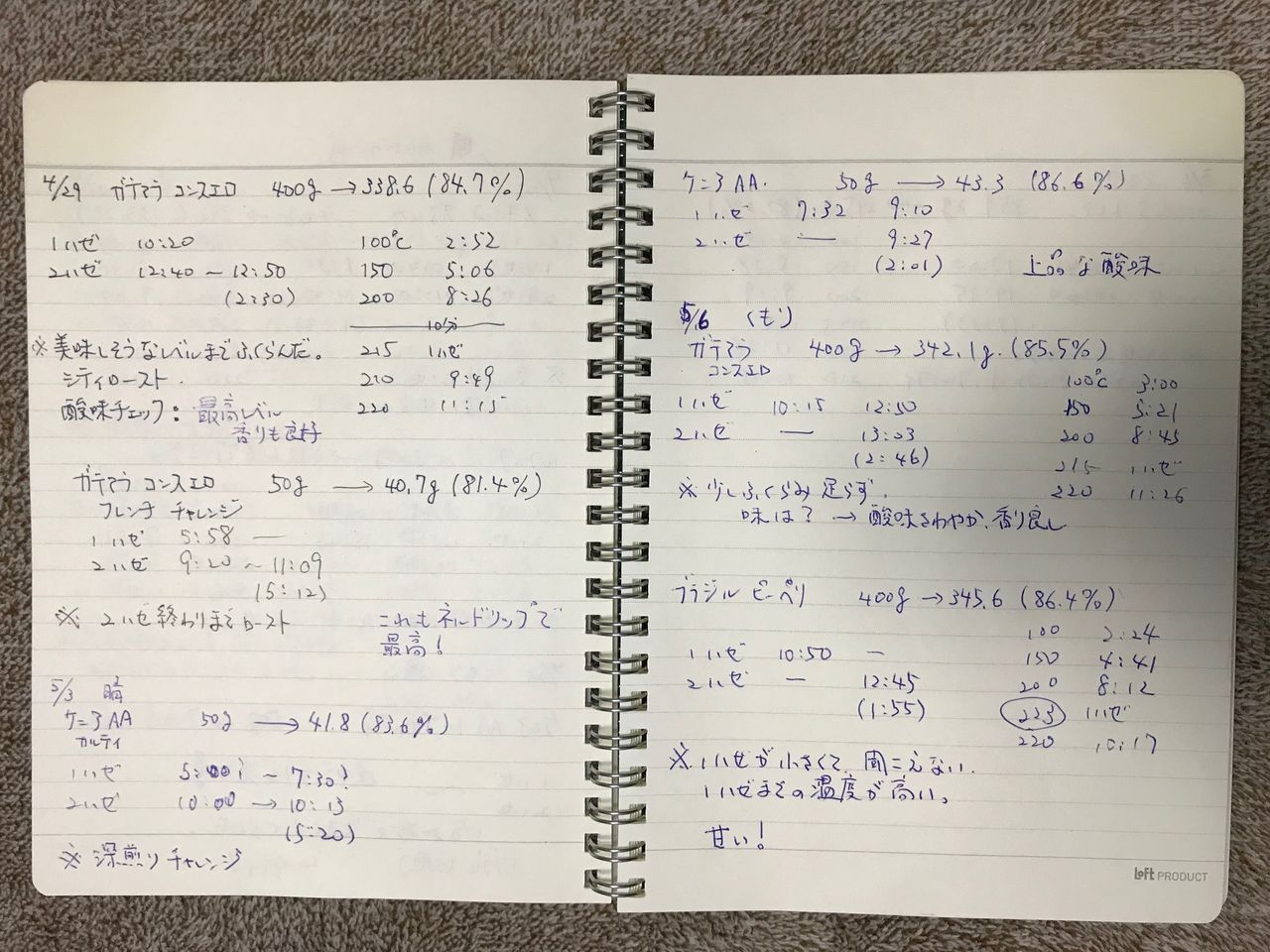 焙煎中はいつもこんな感じで焙煎ノートをつけています。特に分析ということまではしていないけど、いつか役立つのかな。僕の焙煎方法だと、どの豆も基本的に215度で1ハゼがくるんだけど、ブラジルピーベリだけはなぜか223度と高め。音も非常に小さいので分かりにくい。