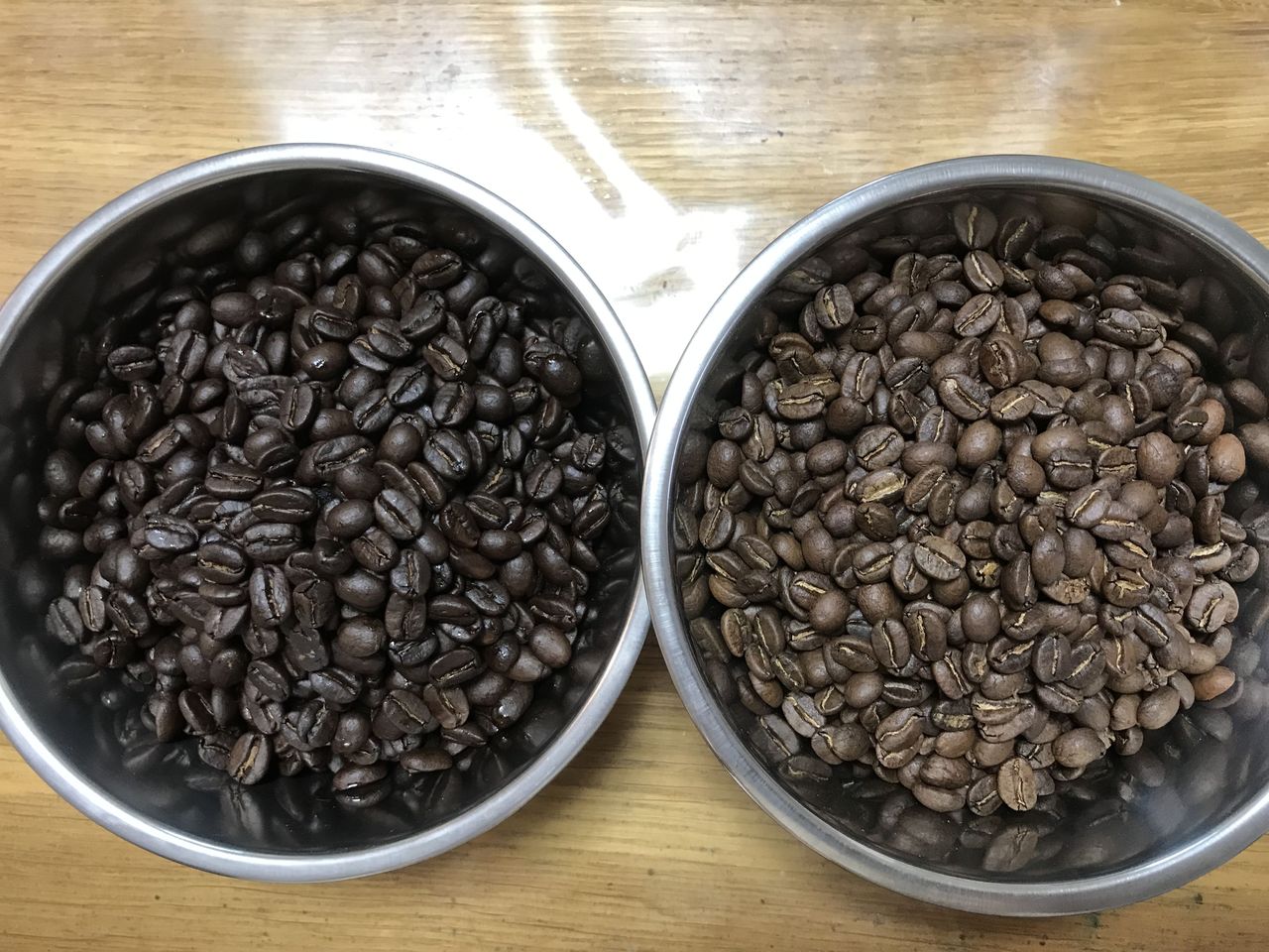 なるべく短時間で豆温度を上げる焙煎実験には先週で一段落つけたので、今週からはまたスロースタート焙煎に戻しています。といっても火力は常に最大で開始するし、気温も高いので、あとはロースターを回す速度を上げることと、1ハゼ開始後、1.5~2分で火力を少し下げること、くらいですが。今週末はコロンビア・ウィラとタンザニアのアデラ・マハレのMIX。特にコロンビアの方は、1ハゼ後を2分ちょうどで止めたものと、4分34秒で止めたものを2種類 焙いてみました。同じ400gの分量で、焙煎時間はトータルで12分44秒(シティロースト)と15分26秒(フルシティ~フレンチ)、水分量の変化は85.5%と81.6%でした。見た目の違いは下の写真のとおり。