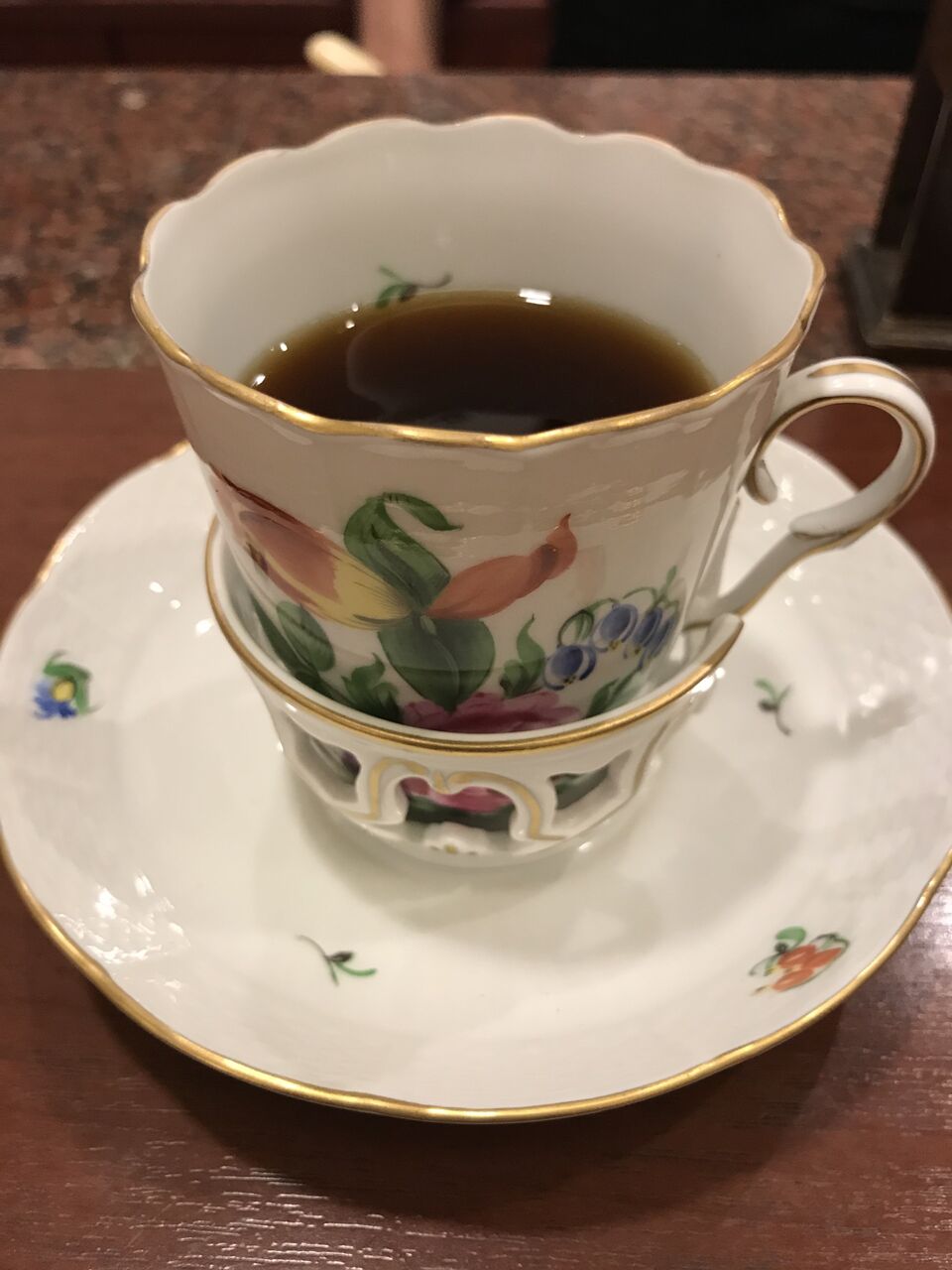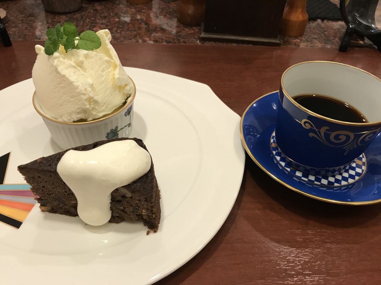 本日はまず、ミディアム・ボディ・テイストのスペシャルブレンドというネルドリップを注文。120ccの豆(見た目40gくらいありそう)に対して、120ccの抽出。ジノリの珍しいカップにいれてもらいました。一緒に頼んだブラウニーには、それより大きなアイスクリームが付きます。美味しい。。