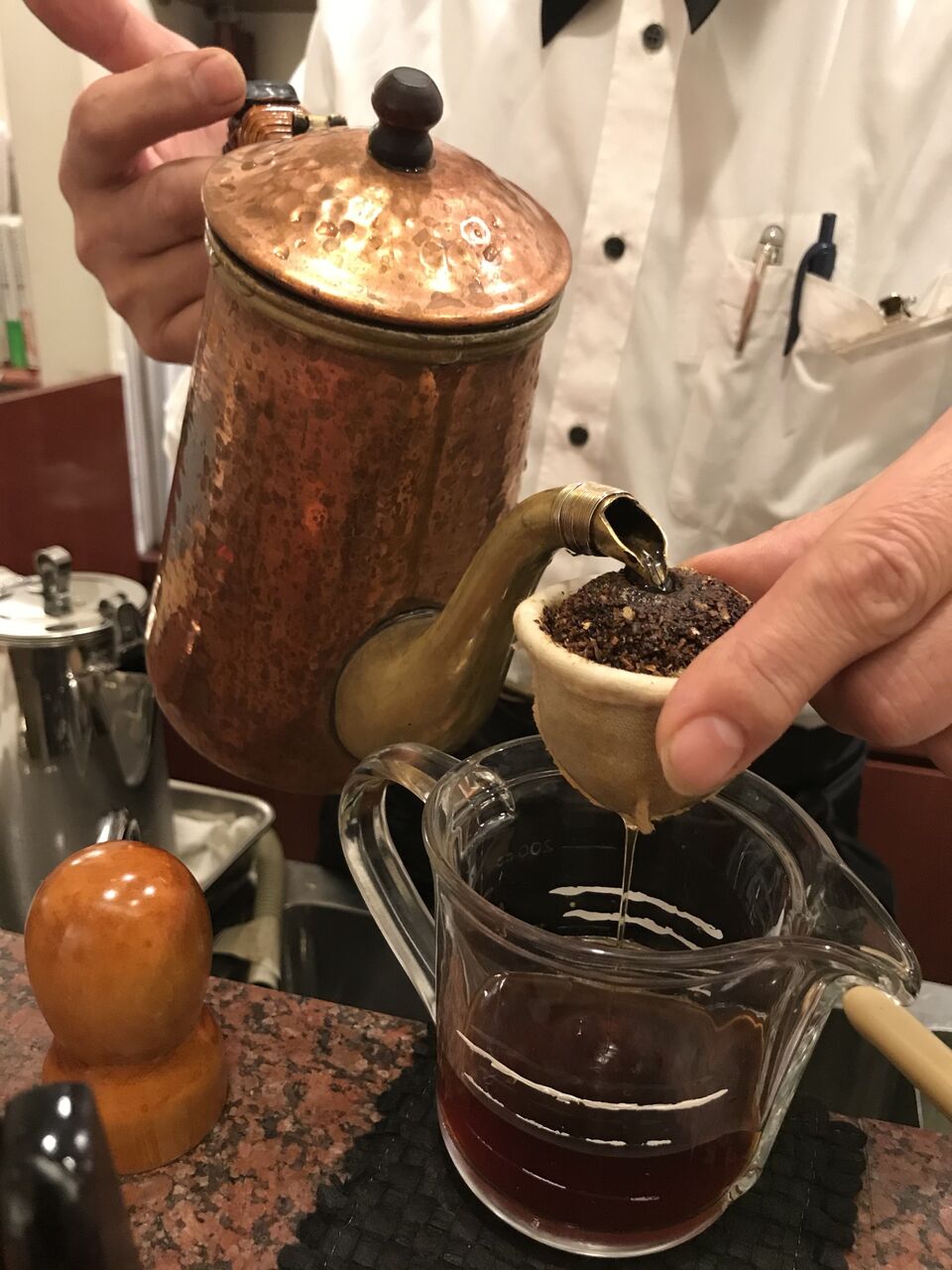 これは2杯目のライト・ボディ・ハーモニーブレンド。常温の水(約20度)でネルドリップします。ポットにはスキッターという特殊な金属器具が取り付けられており、針のような先を豆に差し込むと点滴が行われる仕組みです。これを使って、5分以上かけてドリップします。