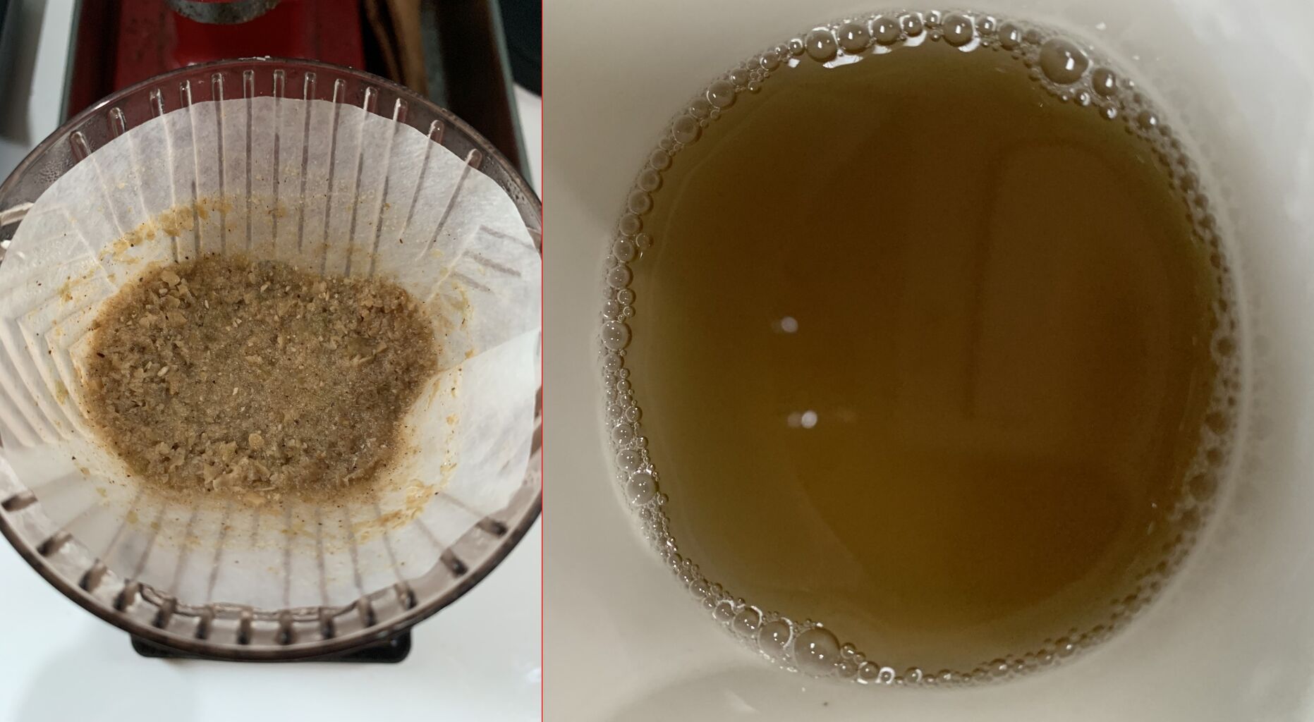もちろん粉は全く膨らまない。出来上がった液体はもう全くコーヒーの体をなしていない。しかし飲んでみると、酸味は全くなく、むしろ仄かに甘い。カスカラティーの味に近いもので、まぁ普通に飲める、といったところ。
