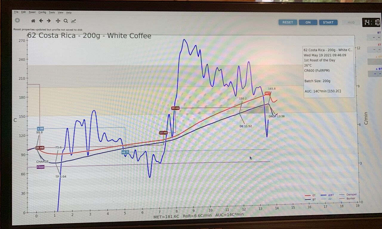 使ったのはコスタリカの豆で、焙煎機への投入温度はかなり低めの100度、取り合えず書かれていたレシピどおり、BT(豆温度)が華氏325度(摂氏163度)になったところで煎り止めした。焙煎時間を長めにするために、Diffuerを閉めて半熱風焙煎モードにして、ガス圧はずっと低いままにした。