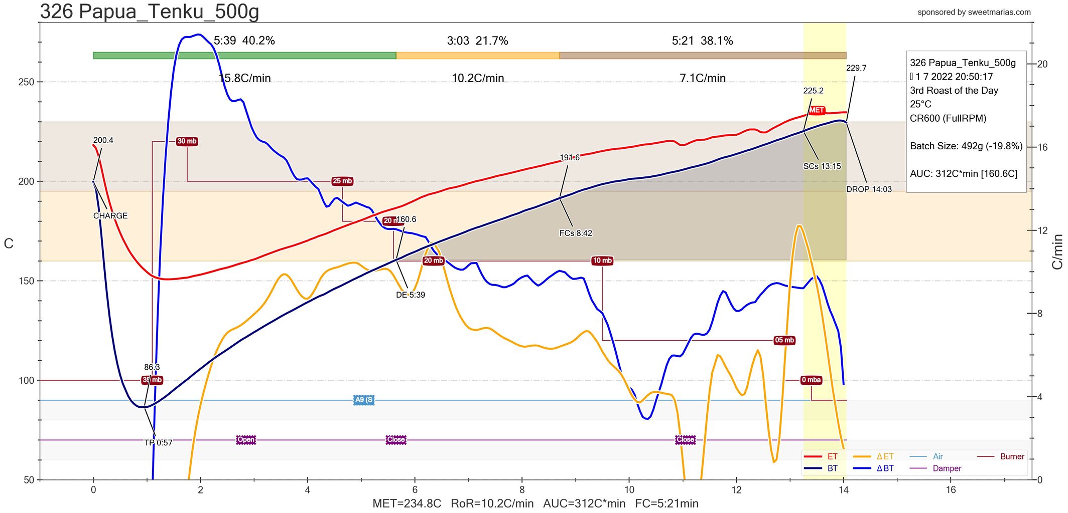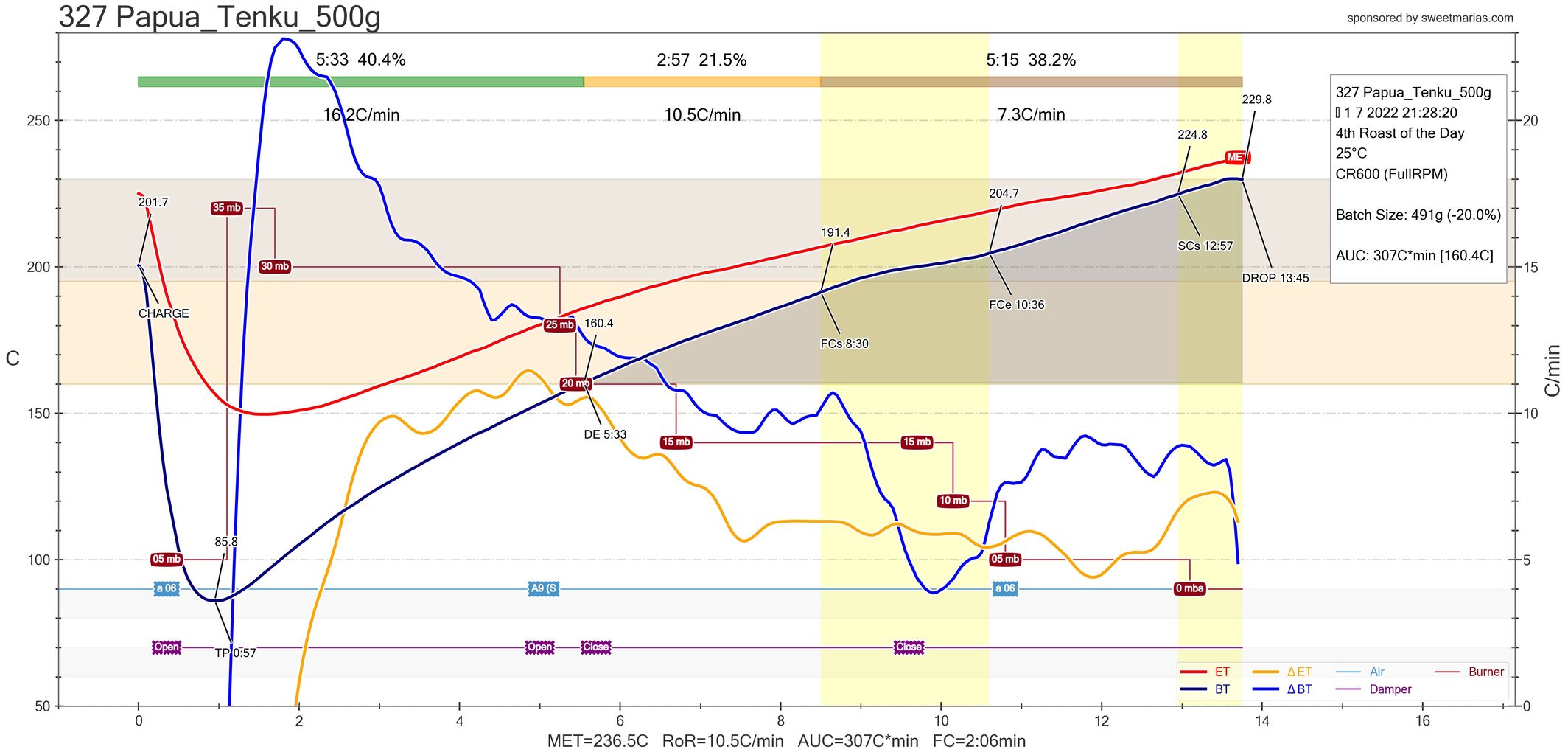 1ハゼのタイミングと温度、排出温度、投入カロリーなど焙煎プロファイルはほとんど一致、当然ながら焙煎指数は完全一致といってよいレベルである。