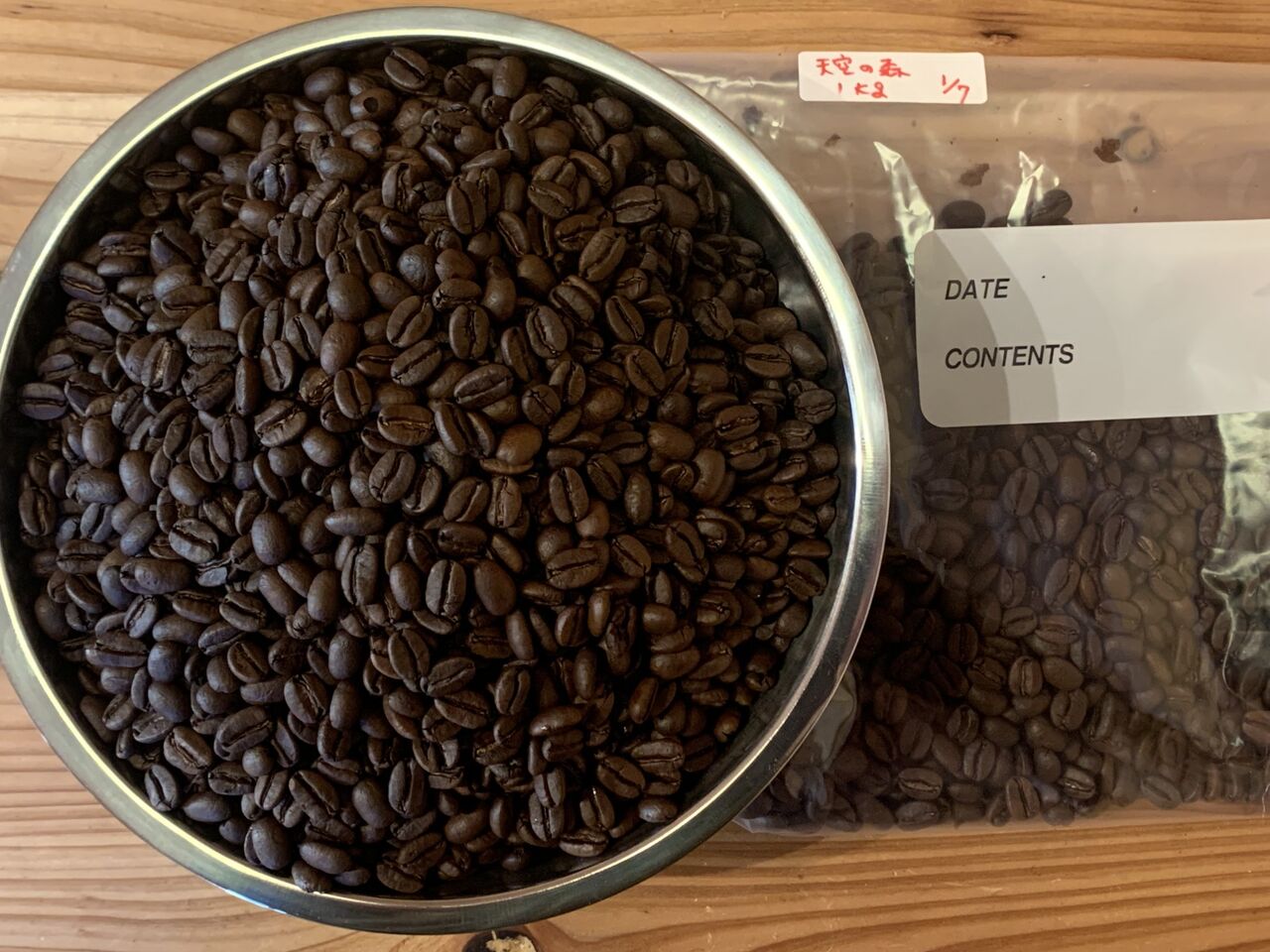生豆で1KG分は、僕の焙煎機の場合、2回に分けて焙煎する必要がある。写真は2回分の焙煎豆を混ぜてしまった後であるが、写真からも均一な色合いは見て取れるだろうか。